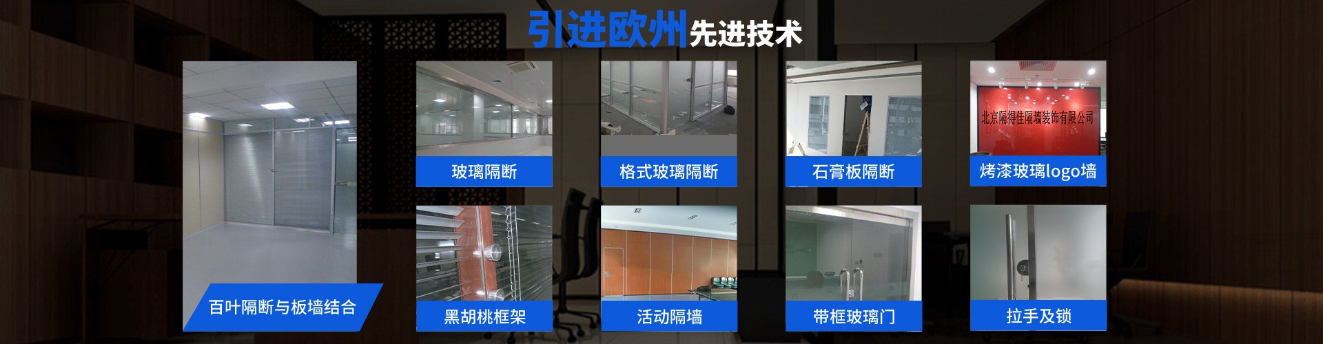 北京隔得佳隔墻裝飾有限公司主要制作與銷售:辦公隔斷,玻璃隔斷,不銹鋼隔斷,辦公玻璃隔斷,雙玻百葉隔斷,活動隔斷,単玻隔斷,辦公玻璃屏風(fēng),背漆玻璃隔斷,遙控電動百葉隔斷,酒店屏風(fēng),宴會廳隔斷,酒店隔斷,固定隔斷,移動玻璃隔斷,活動玻璃隔斷,多功能廳隔間等等,活動隔斷系列廣泛用于會議室,酒店,酒樓,賓館,多功能廳,展廳等場所;玻璃隔斷系列多用于寫字樓,金融機(jī)構(gòu),政府辦公,醫(yī)院,工廠等場所。